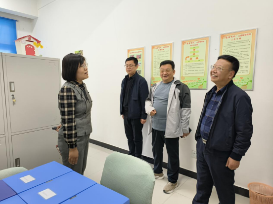 为进一步推进bat365在线官方网站二级心理辅导站标准化建设,2024年4月7日下午,副校长万是明,学生工作部部长付喆,学生处副处长马驰一行在学院党总支书记陈力的陪同下深入国际教育学院二级心理辅导站指导工作。
