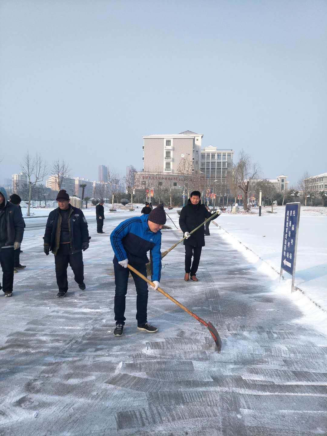 1月10日迎来了2019年的第一场雪。一夜的大雪给老师们校园出行带来困难。清早,后勤管理服务中心主任徐纪珂带领员工们在校南大门及校内环路进行扫雪除冰活动。大家纷纷挥动扫把、铁锨,积极加入到扫雪的队伍当中去,奋力清理道路积雪和冻冰。经过大家的共同努力,很快将校内主干道的积雪清理干净,为全校师生出行安全提供了方便。