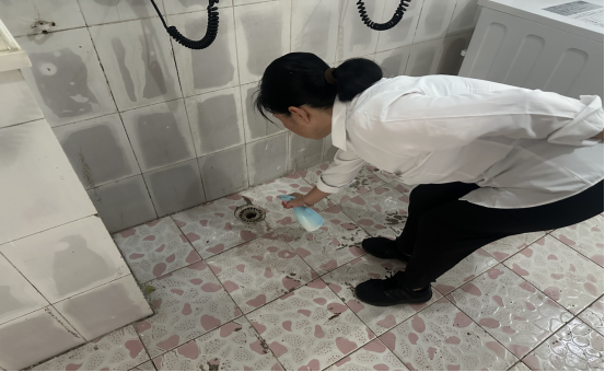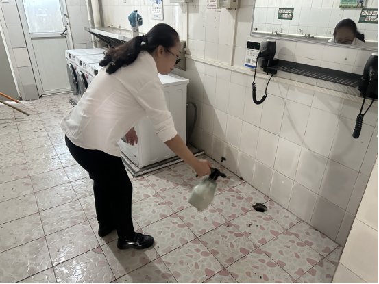 消杀过程中,各楼人员严格按照卫生标准和操作规范,采用低毒、高效的环保药剂,重点对宿舍楼的楼道、楼梯间、卫生间、垃圾存放处、墙角缝隙等病媒生物易滋生区域进行喷洒和处理,同时针对宿舍门窗周边、排水管道口等关键部位进行细致防护,有效降低蚊虫、蟑螂、老鼠等病媒生物的滋生和传播风险。