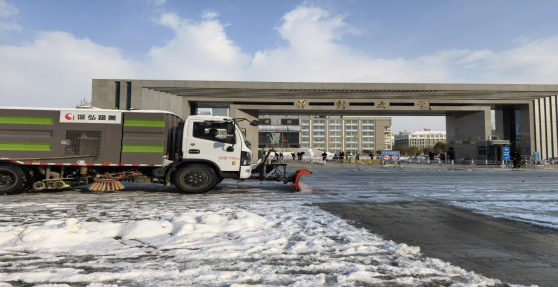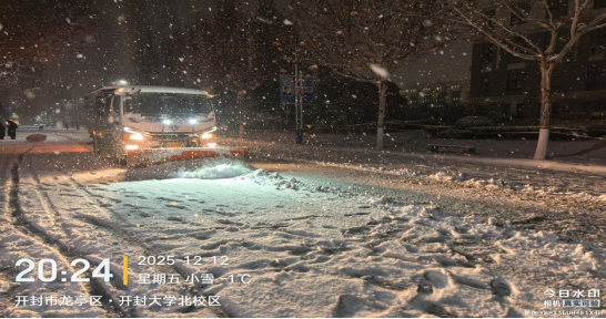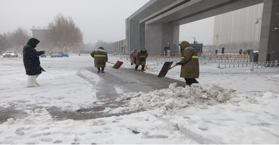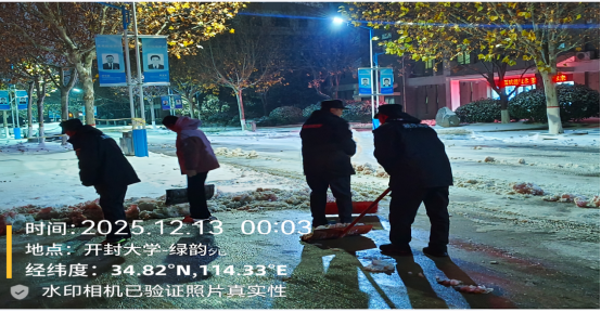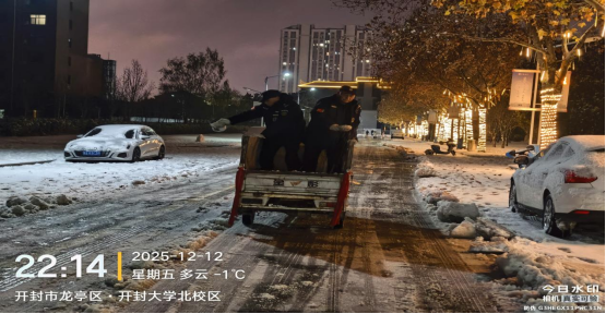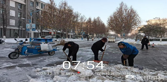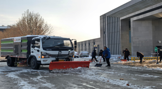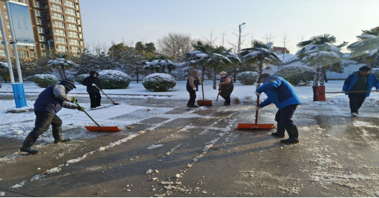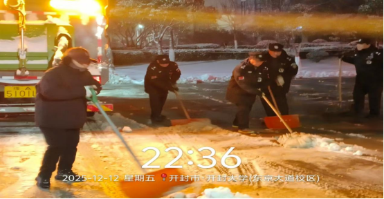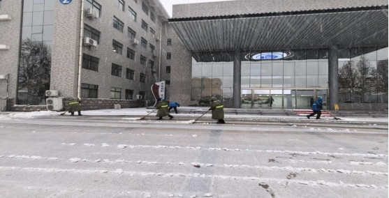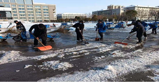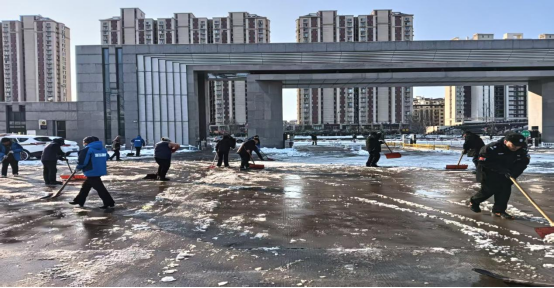 13日,深弘物业安排在岗人员肃清道路积雪,工作人员不怕苦、不怕累、不畏严寒,奋战一线。高效恢复道路畅通,用昼夜坚守筑牢师生出行安全防线。