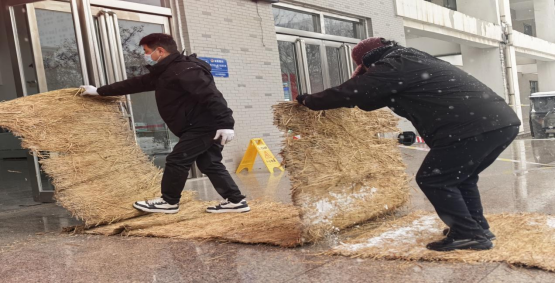 1、工作人员为各楼宇铺设防滑垫;