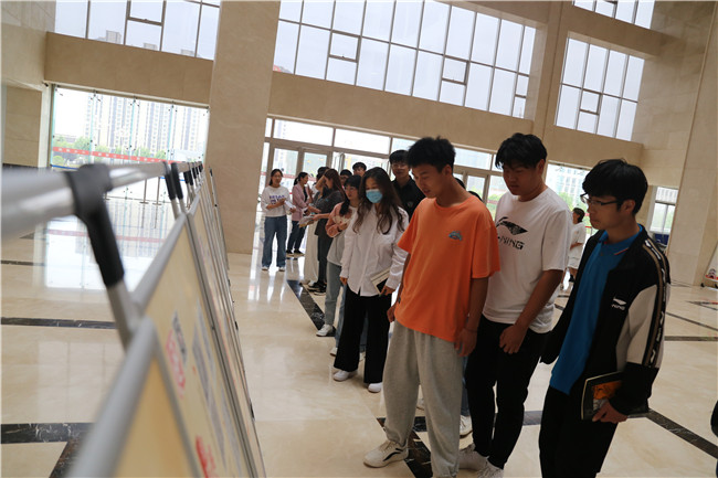 师生参观学习校图书馆二楼大厅举办的开封红色党史图片展