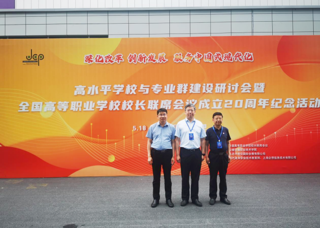 本站讯 5月19日,高水平学校与专业群建设研讨会暨全国高等职业学校校长联席会议成立20周年纪念活动在安徽省合肥市召开。校长宋晓炜、副校长万是明参加会议。