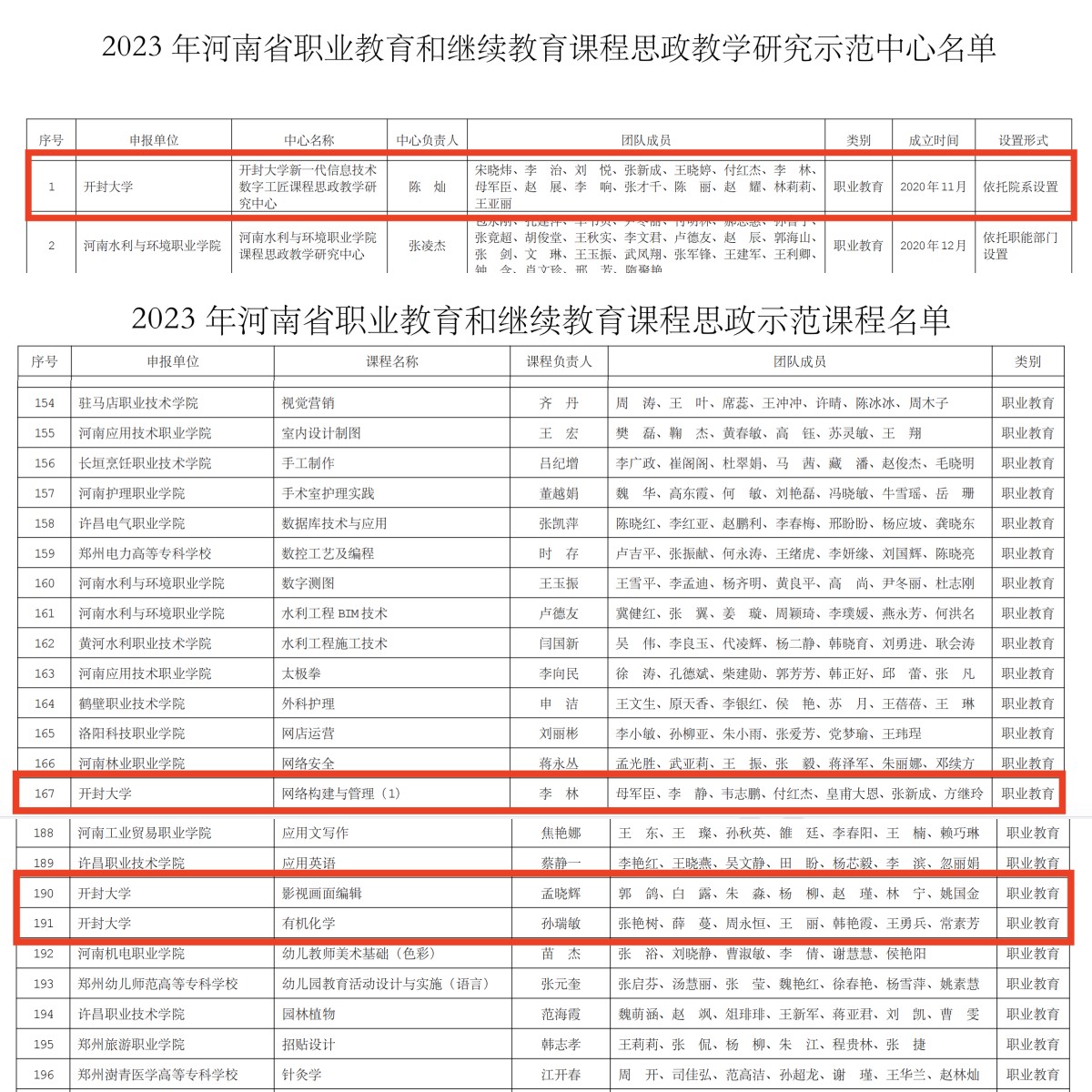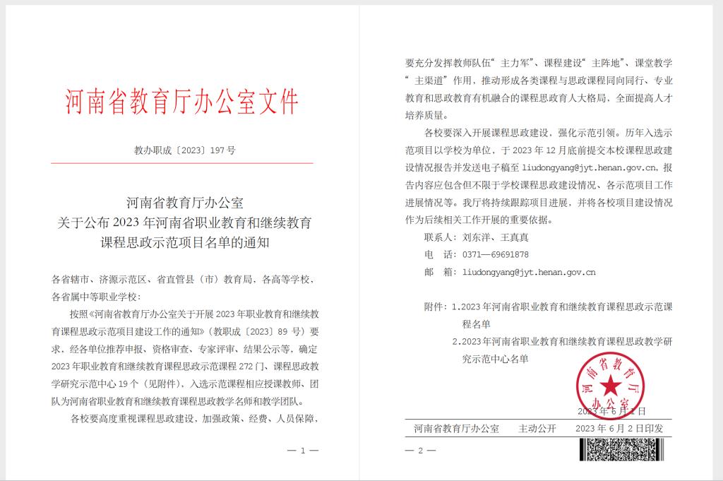 本站讯 近日,河南省教育厅下发《关于公布2023年河南省职业教育和继续教育课程思政示范项目名单的通知》(教办职成〔2023〕197号),由校党委书记陈灿负责、依托信息工程学院设立的“bat365在线官方网站新一代信息技术数字工匠课程思政教学研究中心”入选2023年河南省职业教育课程思政教学研究示范中心,《有机化学》《网络构建与管理(1)》《影视画面编辑》3门课程入选2023年河南省职业教育课程思政示范课程。