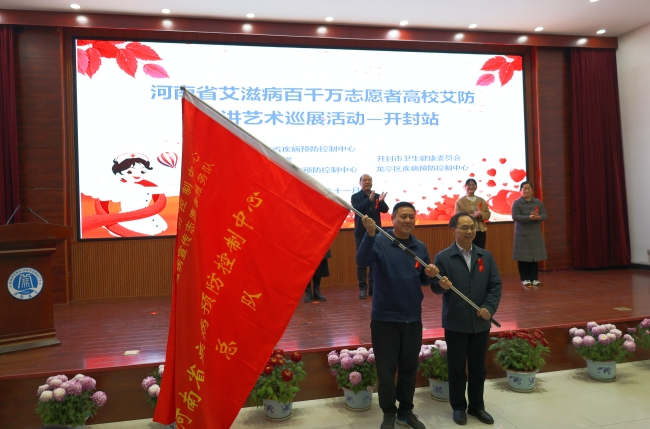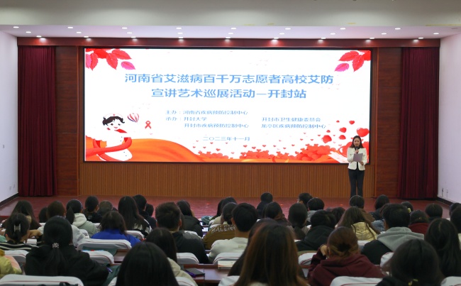 本站讯 为加强大学生群体的防艾意识,推进艾滋病防治工作,持续发挥好志愿者的主力军作用,11月16日,河南省艾滋病百千万志愿者高校艾防宣讲艺术巡展活动在我校举行。河南省疾控中心性病艾滋病防治研究所副所长李宁、开封市疾控中心党委副书记梁建立、校党委副书记储建新出席活动,我校师生代表400余人参加此次活动。
