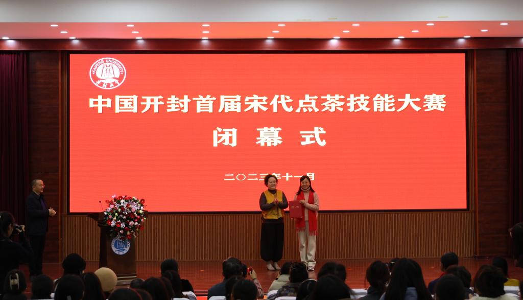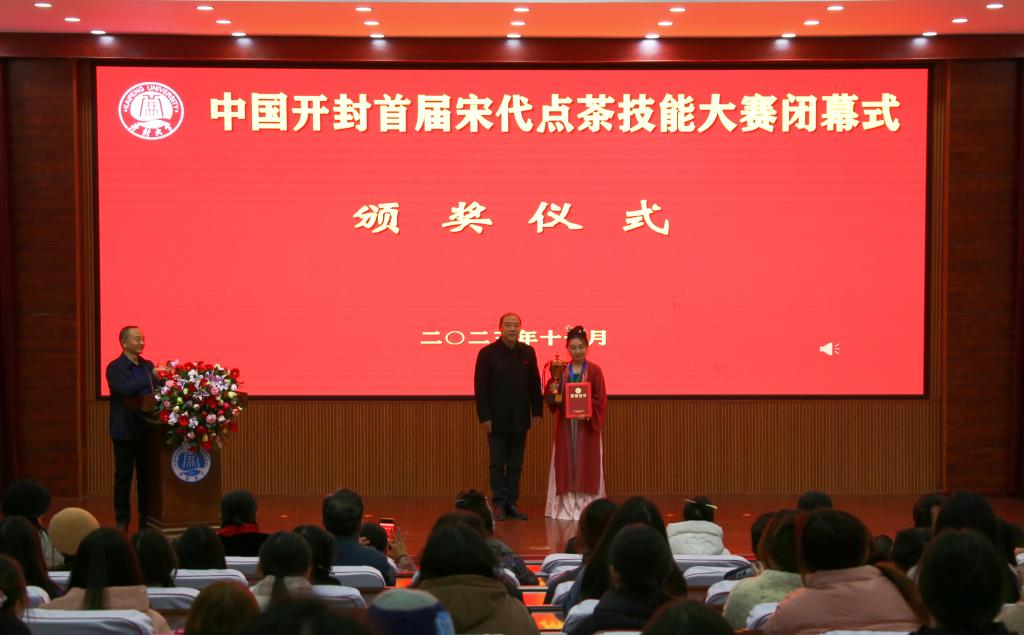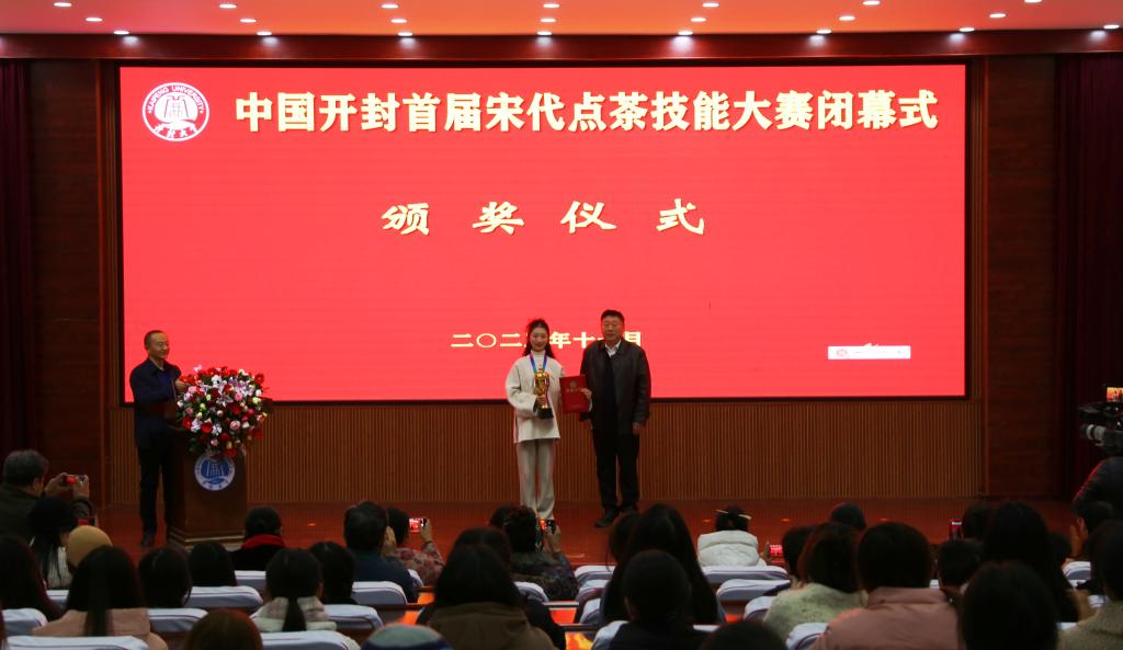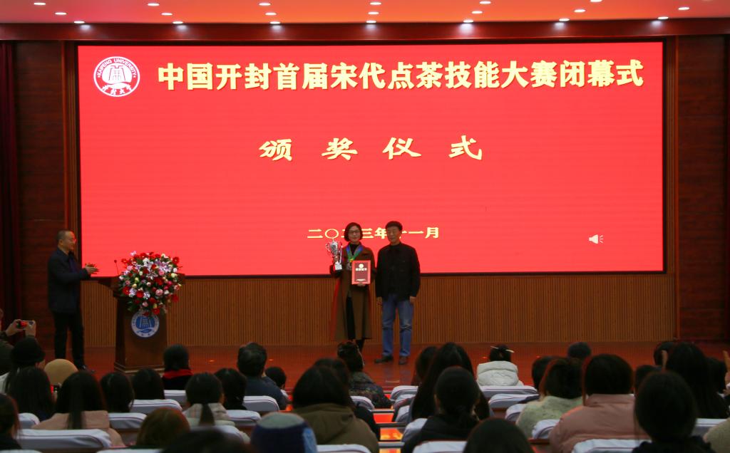 在闭幕式上,李治宣读了中国开封首届宋代点茶技能大赛获奖名单。于吉良、王树强、储建新为获奖选手代表颁发了奖杯、奖牌和荣誉证书。乔臻茜为裁判员代表颁发证书。