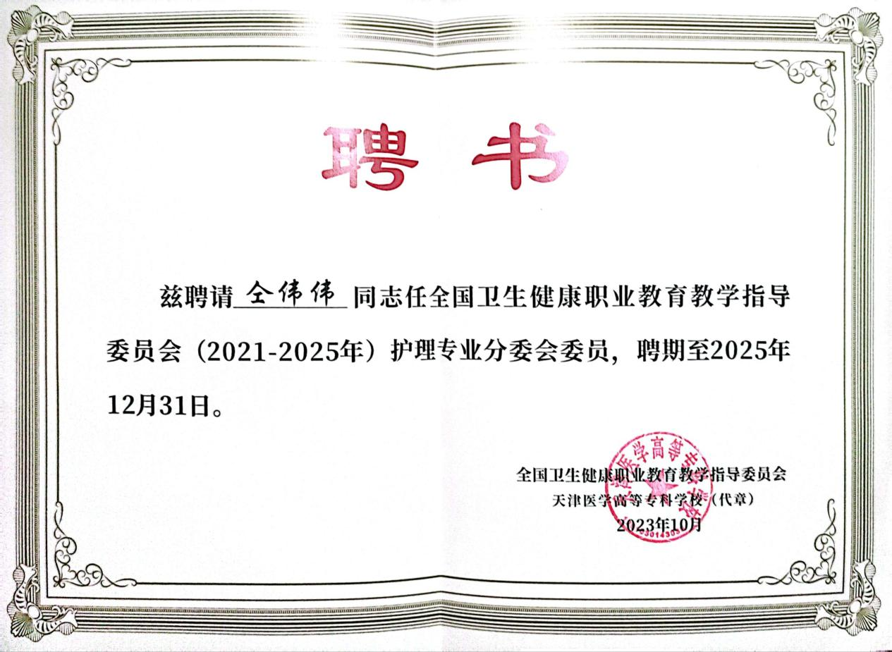 夯基垒台、赋能发展。此次,我校教师被聘任全国卫生健康行指委委员,必将有利推动我校护理专业与其他兄弟院校之间的交流沟通,促进我校护理专业建设水平及人才培养质量跨越式提升。