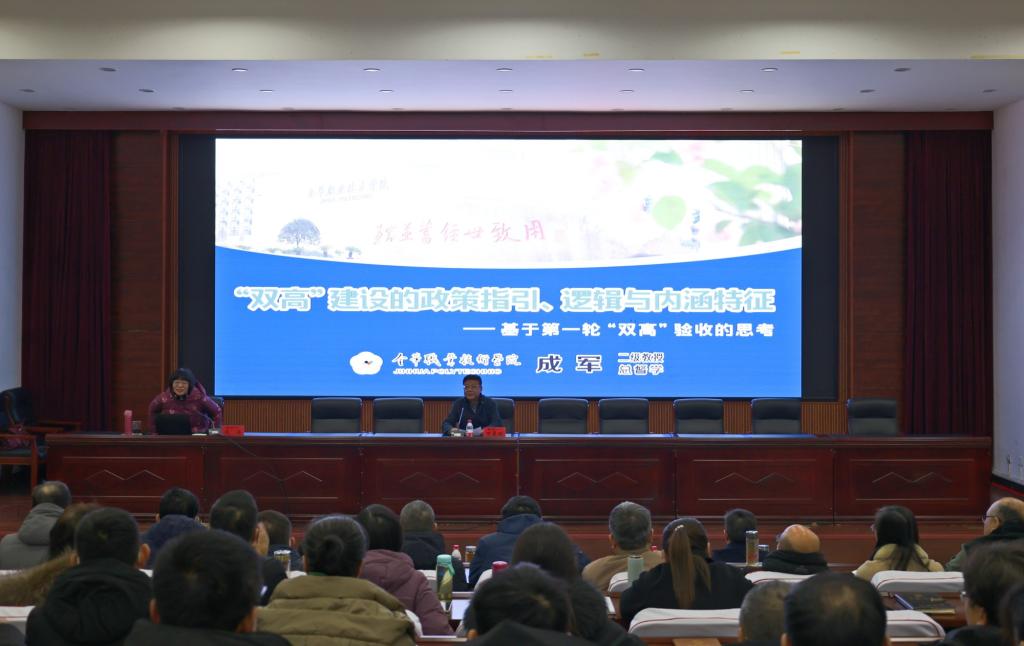 本站讯  1月9日上午,“开大讲坛”系列报告第二十讲在行政楼第一会议厅举行。金华职业技术学院总督学、学术委员会主任、二级教授成军,应邀作了“‘双高’建设的政策指引、逻辑与内涵特征---基于第一轮‘双高’验收的思考”的主题报告。全体校领导班子成员、中层正副职干部、院部副科级干部(含教研室主任)到场聆听。报告由副校长万是明主持。