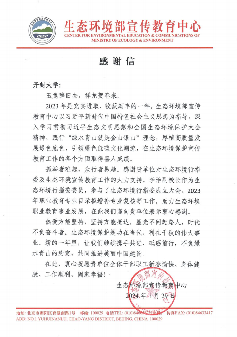 本站讯 近日,生态环境部宣传教育中心向我校发来感谢信,感谢我校对生态环境行指委及生态环境宣传教育工作的大力支持,并对学校全体干部职工给予了春节来临之际的美好祝愿。