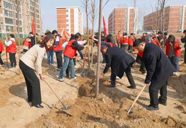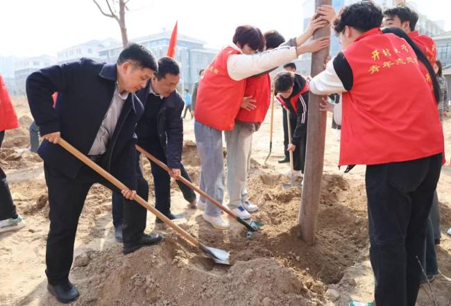 本站讯 草长莺飞,春光和煦,植树添绿正当时。为进一步贯彻落实党的二十大精神和习近平生态文明思想,在第46个植树节到来之际,我校开展以“共同创造绿色、生机、健康的希望校园”为主题的植树节活动,校党委书记谭贞、校长王德如,校领导班子成员带领100余名师生开展义务植树活动。