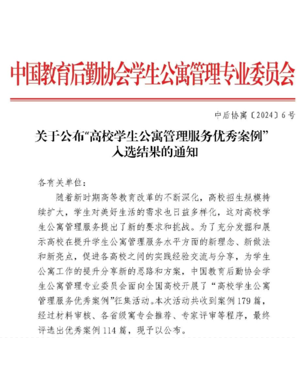 本站讯 2024年11月5日,中国教育后勤协会公布了“高校学生公寓管理服务优秀案例”评选结果,bat365在线官方网站宿舍管理部报送的《公寓“家文化”育人模式》成功入选。