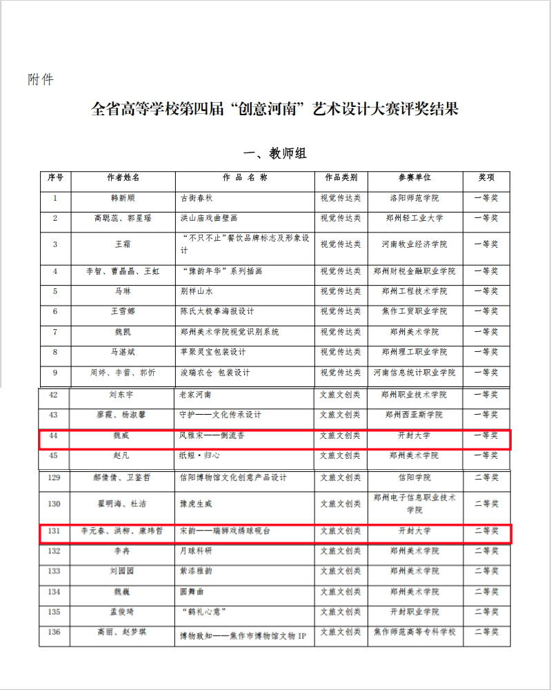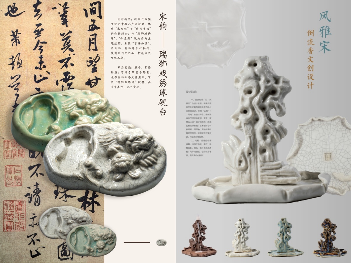 近日,由河南省教育厅主办,郑州美术学院和黄河科技学院承办的第四届“创意河南”艺术设计大赛圆满圆满落幕。我校大观博物馆选送的文旅文创设计作品《风雅宋——倒流香》荣获一等奖,作品《宋韵——瑞狮戏绣球砚台》荣获二等奖。