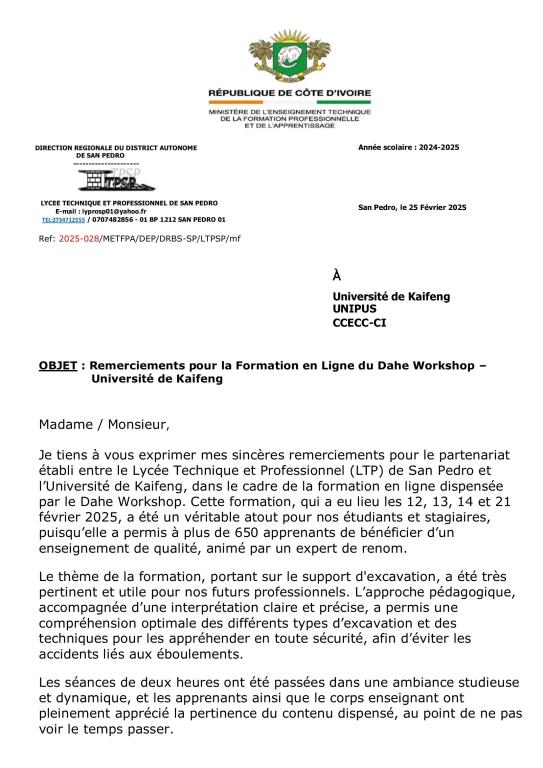 在感谢信中,圣佩德罗职业技术学院院长MORIE Florent表示,本次培训内容紧密贴合实际,实用性极强。学员们不仅系统深入地掌握了基坑支护的相关理论知识,还在实践操作能力上得到了显著提升。