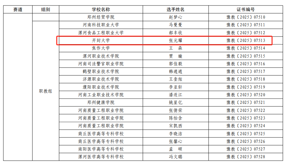 本站讯 近日,河南省教育厅公布了第二届全国大学生职业规划大赛2024年河南省赛获奖名单。我校智能制造学院张元耀同学荣获成长赛道职教组铜奖,艺术设计学院寇茵、医学院张一湦同学荣获就业赛道职教组铜奖。