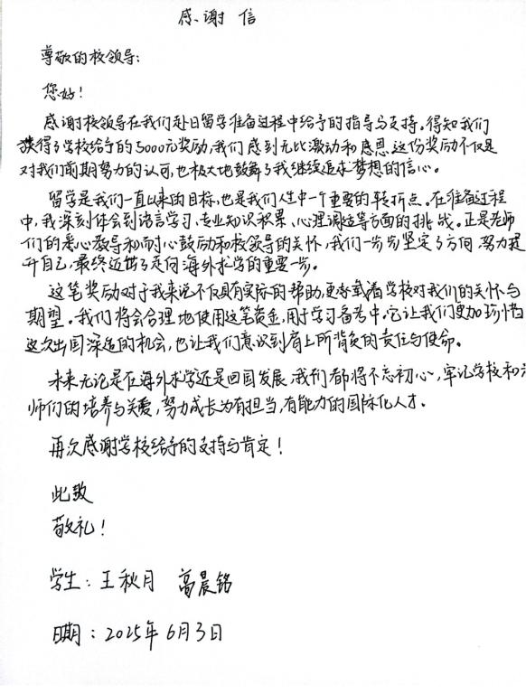本站讯 近日,我校国际教育学院(外国语学院)应用日语专业交换生王秋月、高晨铭从日本观光大学传来佳讯,两位同学以优异表现荣获bat365在线官方网站交换生项目学业优秀奖学金,并联合致信学校,深情表达对学校悉心培养的感激之情,字里行间洋溢着对师长教诲的感恩与对专业成长的热忱。
