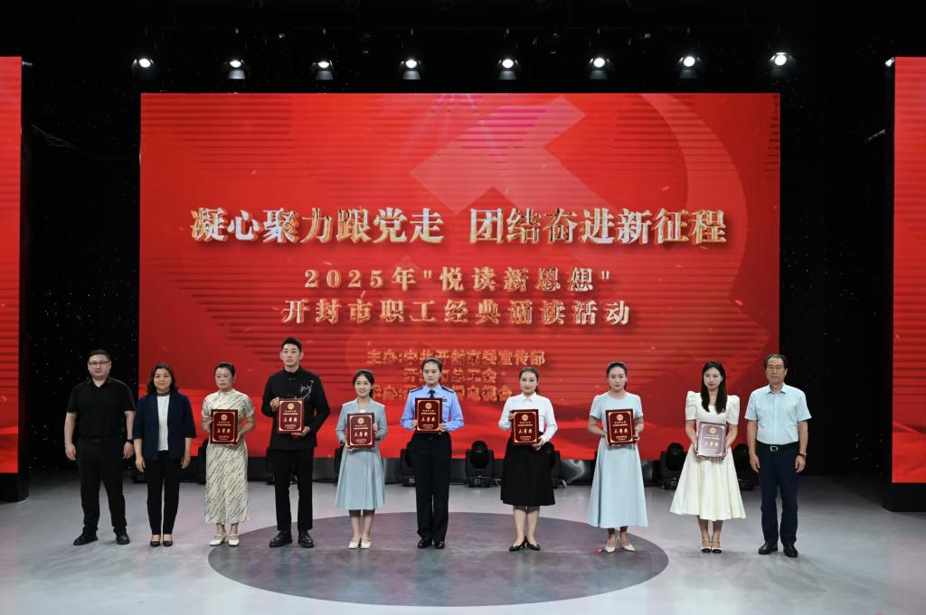 本站讯 7月1日上午,由开封市委宣传部、市总工会主办的“悦读新思想”开封市职工经典诵读活动在开封市广播电视台落下帷幕。我校参赛选手凭借出色表现,从众多参赛队伍中脱颖而出进入决赛,取得优异成绩。