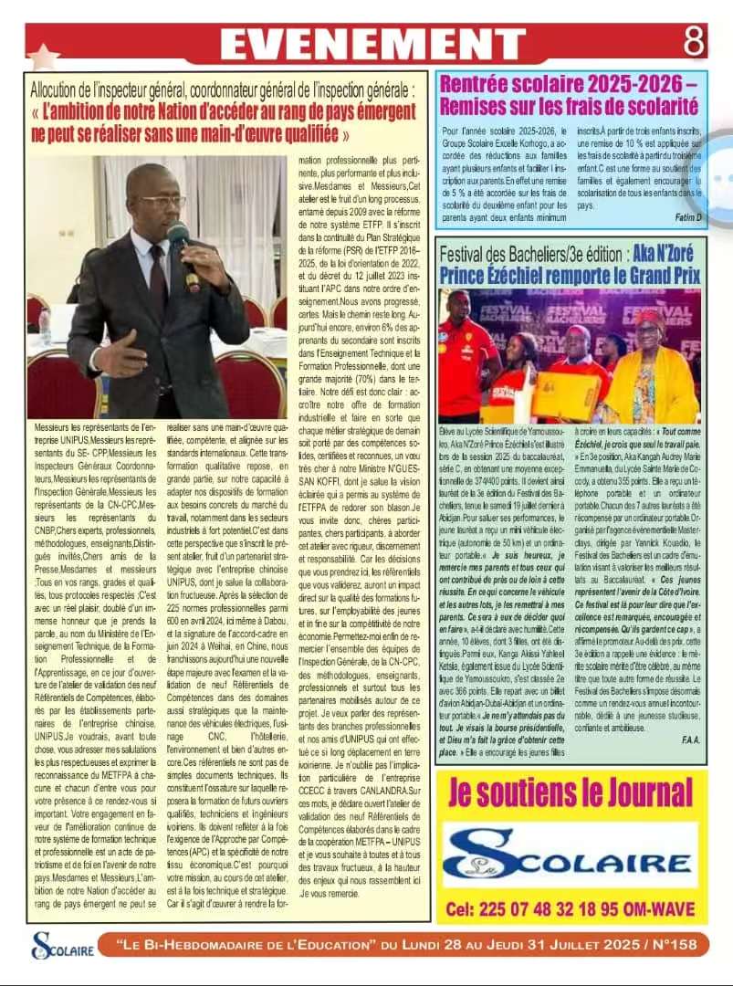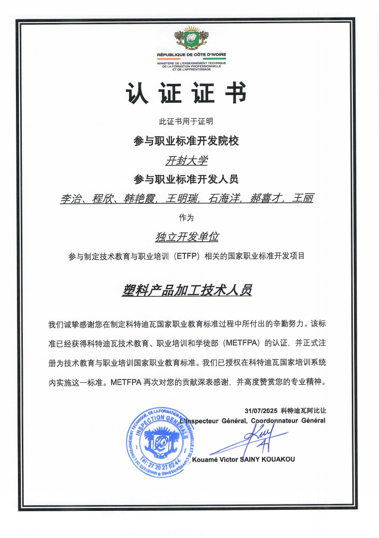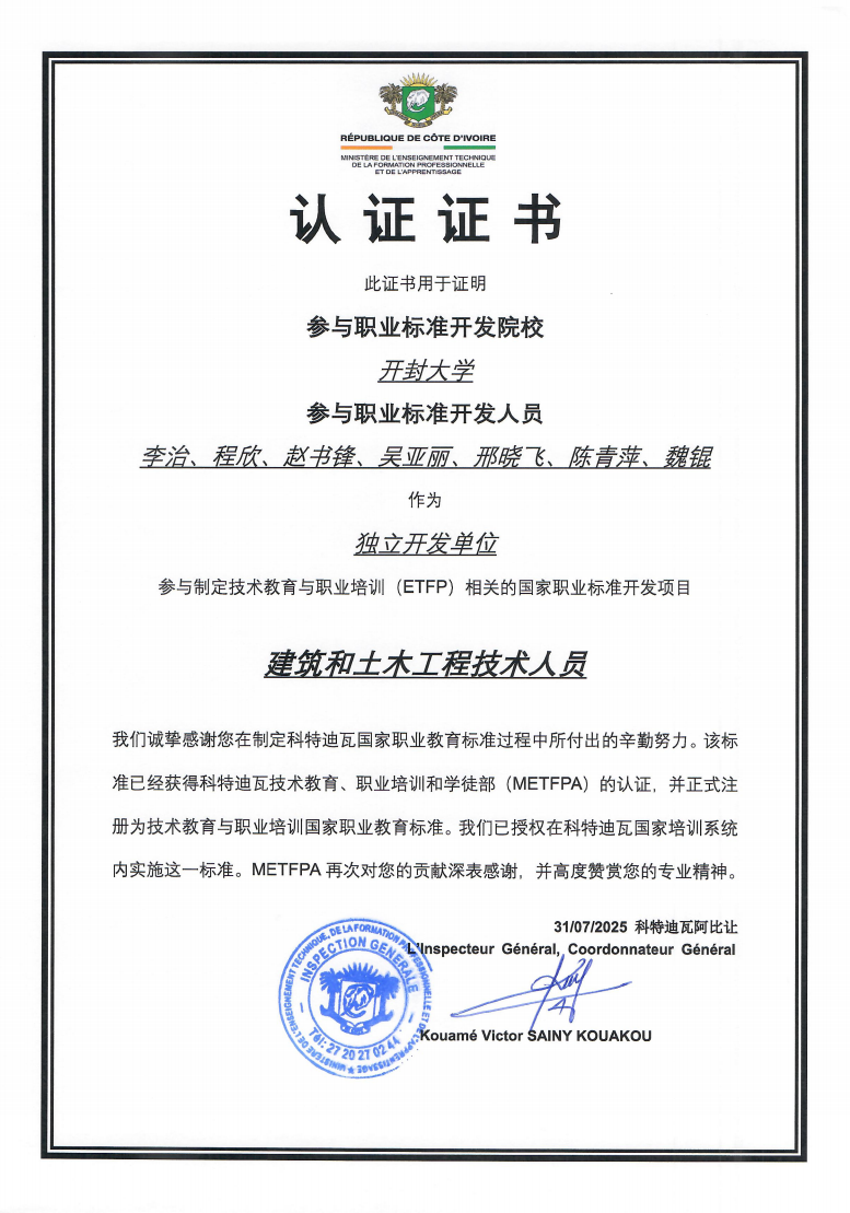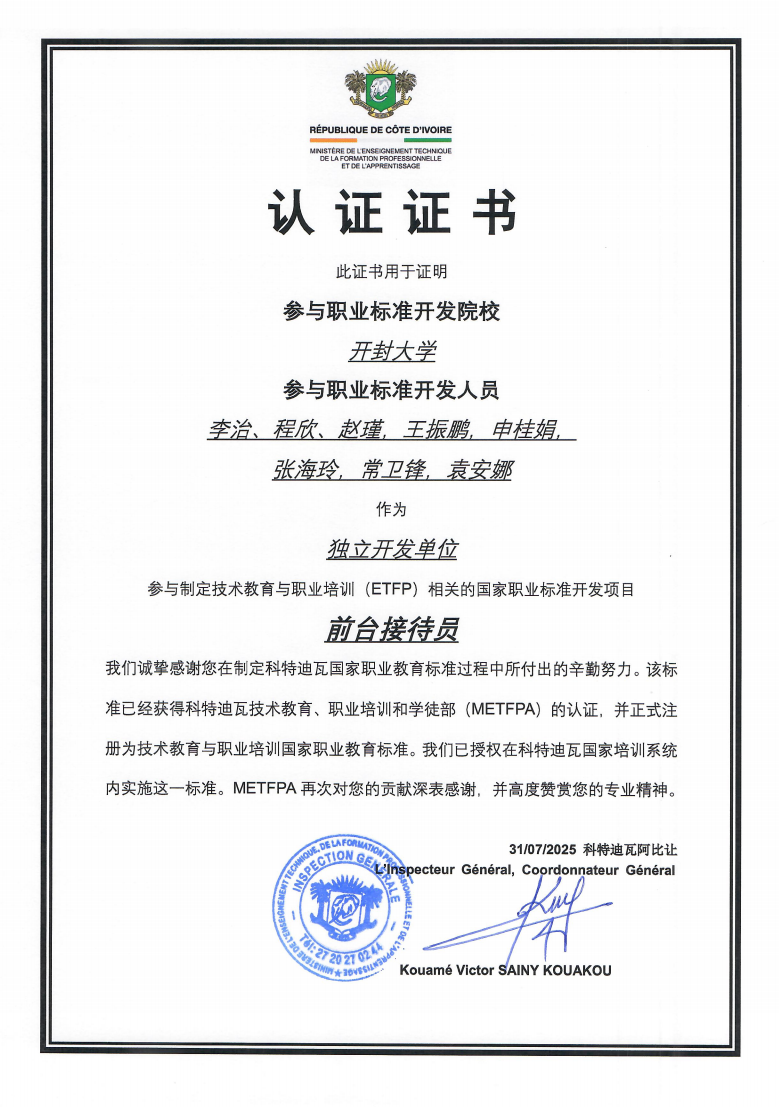 作为核心参与院校,bat365在线官方网站凭借在职业教育领域内人才培养、专业建设与产教融合方面的丰富经验,独立开发的“建筑和土木工程技术人员”、“前台接待员”、“塑料产品加工技术人员”三个职业标准获得科特迪瓦技术教育、职业培训与学徒事务部(METFPA)认证,正式注册为技术教育与职业培训国家职业教育标准,同时获权在科特迪瓦国家培训系统内实施。科特迪瓦官方宣布,审定通过的标准将直接应用于当地工人、技师及工程师培养。科特迪瓦总督学SAINY KOUAKOU Kouamé Victor特别指出,获得认证的标准“将成为培养科特迪瓦技术人才的核心依据”,彰显了中国职教标准国际化的创新路径。研讨会获科特迪瓦新闻通讯社(AIP)、Le Scolaire等多家国家级新闻机构和权威刊物的重点报道,进一步扩大了bat365在线官方网站职教品牌的海外影响力。