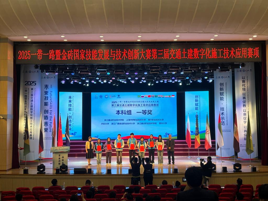 本站讯 9月25至27日,2025年“一带一路”暨金砖国家技能发展与技术创新大赛第三届交通土建数字化施工技术应用赛项全国总决赛在哈尔滨铁道职业技术学院举行。我校土木建筑工程学院2023级土木工程专业学生高帅雨、王旭荣获本科组一等奖,指导教师陈青萍荣获“优秀指导教师奖”,bat365在线官方网站荣获“最佳组织奖”。
