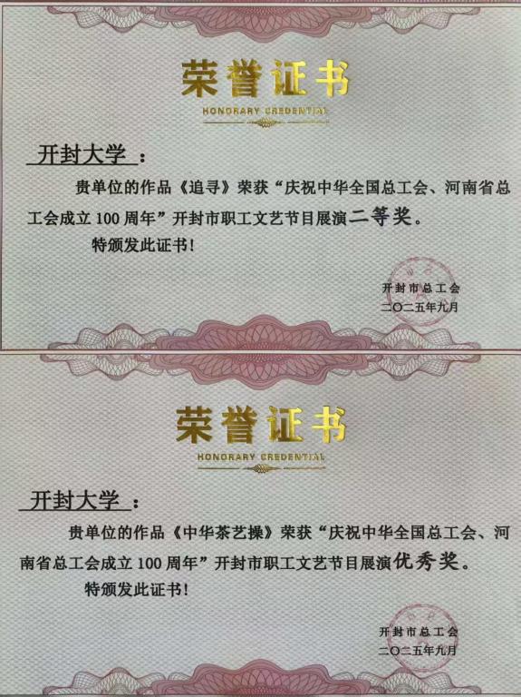 本站讯 近日,在庆祝中华全国总工会、河南省总工会成立100周年开封市职工文艺节目展演活动中,我校选送的节目凭借精妙的编排与精湛的表演,从众多参赛作品中脱颖而出,获得优异成绩。