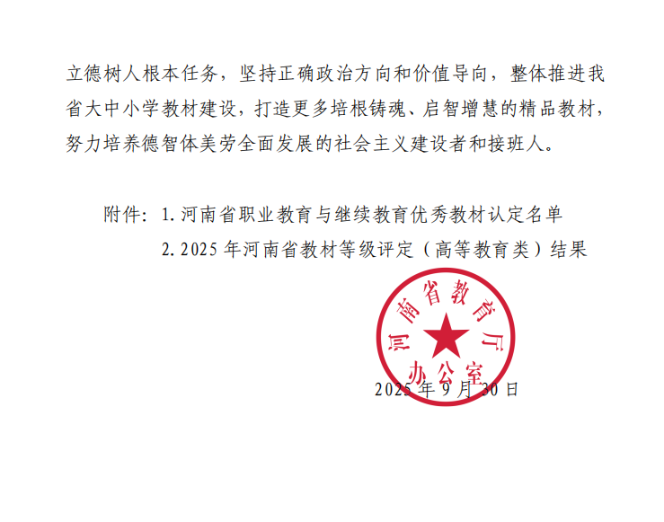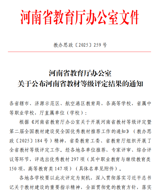 本站讯 近日,河南省教育厅发布《关于公布河南省教材等级评定结果的通知》(教办思政〔2025〕259号),经教师个人申报、学校择优推荐,省教育厅评审遴选,我校共有3部教材荣获“2025年河南省职业教育与继续教育优秀教材”。