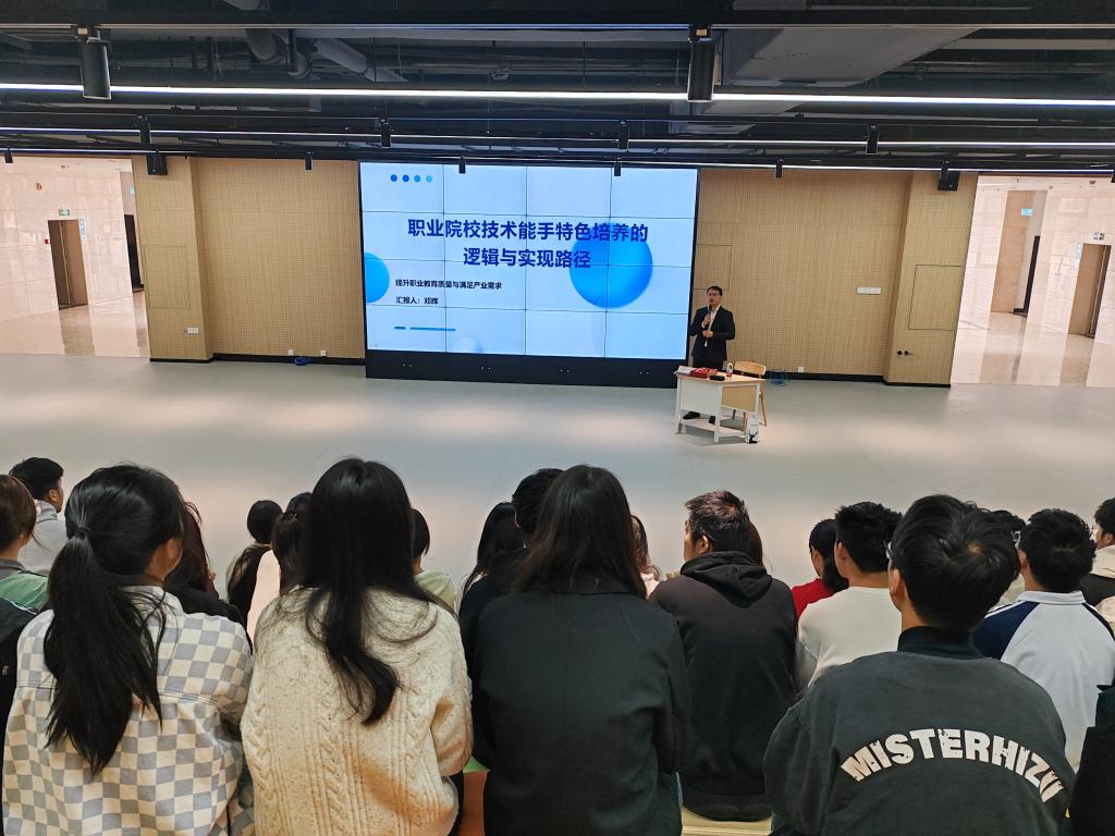 报告会上,邓辉结合自身成长经历,从技术能手培养与产业需求的契合、人才成长的逻辑、教育创新、课程体系建设、师资队伍优化、产教深度融合、技能大赛和创新创业活动、评价体系建设七个方面阐述了职业院校如何促进技术能手的培养,并与现场师生进行互动交流。会后,邓辉与我校创新创业学院99℃创客空间师生团队进行了深入交流。