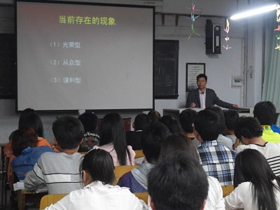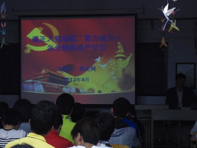 本站讯(记者李记卫) 为了使同学们端正入党动机,早日加入中国共产党,我院于4月23日在一号楼216教室举行以“端正入党动机,努力成为一名合格的共产党员”为主题的党课培训。我院党总支副书记徐纪珂担任此次主讲,全院入党积极分子听取了此次党课。