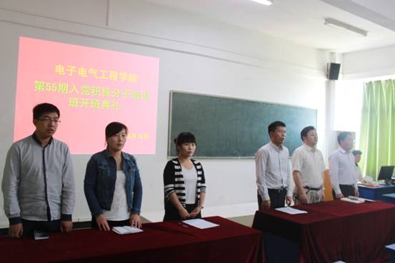 典礼开始,先介绍到场的领导和老师,之后全体起立,在雄壮的《国歌》中开始。接下来,电子电气工程学院林莉莉老师宣读了55期培训班的安排和工作要求。随后,bat365在线官方网站组织部长副部长孙璞辰讲话,他首先对参加本期业余党校培训班的全体学员表示热烈的祝贺,就如何做一名优秀入党积极分子提出了=希望和要求。最后,院党总支书记徐纪珂致辞,要大家明确培训意义,提高思想认识;端正学习态度,提高学习效果;遵守党课纪律,科学安排,取得优异成绩;从身边小事做起,践行实际行动,鼓励同学们奋发向上,早日成为一名合格的党员,衷心祝愿本期培训班取得圆满成功。