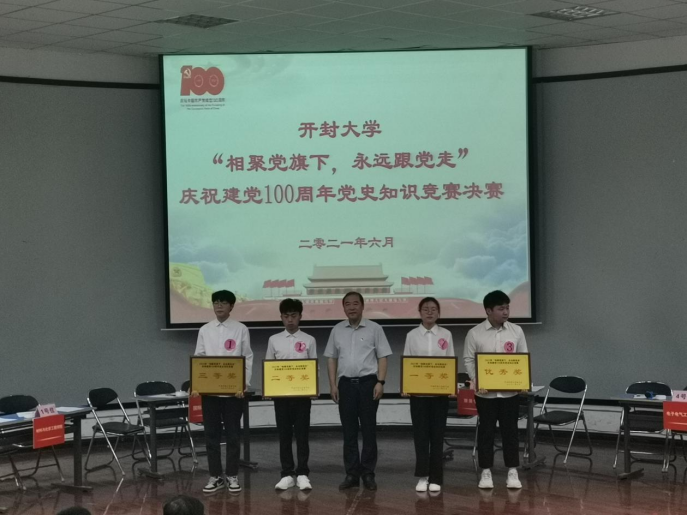 决赛环节分为个人必答题、团队必答题、抢答题和风险题。主持人宣布竞赛开始后,现场气氛十分热烈。个人必答题环节我院选手们沉着冷静,答题正确率高。团队必答题环节中,选手们密切配合,展现了良好的团队协作精神。最后抢答题和风险题将比赛推入高潮,各支参赛团队反应迅速,对答如流,竞相展现了参赛队员们扎实的党史知识。最后我院选手以微弱劣势获得第三名。学院党委副书记褚建新为获奖队伍颁奖,并作点评。他指出这次党史知识竞赛是庆祝建党一百周年的活动之一,希望广大学生们继续坚持学习,从我们党的百年历史中汲取精神养分,在党史中磨砺提升自我。真正做到学史明理、学史增信、学史崇德、学史力行。