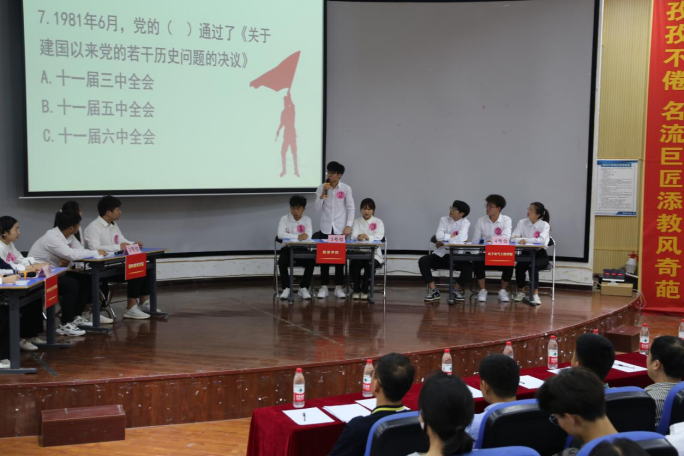 2021年6月17日下午三点,bat365在线官方网站庆祝建党一百周年党史知识竞赛决赛在国际教育学院一楼报告厅拉开帷幕。校党委副书记褚建新,校党委委员、组织统战部部长赵海胜,旅游学院党总支书记尤影,后勤管理服务中心主任徐纪珂,后勤管理服务中心党支部书记田路春以及各院部师生代表出席活动。