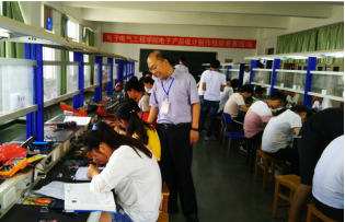 比赛共分为现代电气调速控制组、单片机技术应用组和电子技术应用组同时进行。竞赛现场先后进行了原理图设计、电路板焊接以及电路板调试等内容,参赛学生全神贯注,一丝不苟,充分体现了对所学知识的掌握,同时将学习实践与“工匠精神”相结合,进一步诠释了“工匠精神”的深刻内涵。经过6个小时的紧张奋战,所有参赛选手顺利的完成了比赛项目。在比赛的过程中,学校实验实训处长肖兴达莅临现场观摩指导。