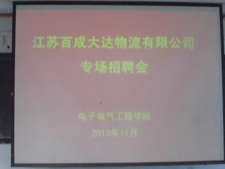 2013年11月2日上午,江苏百成大达物流有限公司在我院216多媒体教室举行专场招聘会,我院2014届毕业生同学针对自己的能力和专长等方面的综合考虑积极投递简历,参与企业宣讲、面试等环节,预祝同学们顺利找到自己想要从事的工作企业单位。