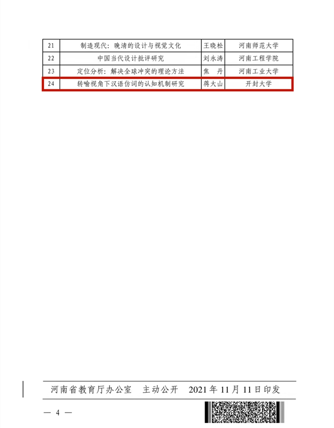 近日,从河南省教育厅获悉,我校国际教育学院副院长蒋大山博士的《转喻视角下汉语仿词的认知机制研究》获河南省高等学校哲学社会科学优秀著作项目立项。该书稿研究对象为汉语中的各类仿词在转喻框架中的生成与理解机制,主要价值在于发现汉语隐性仿词和间接仿词的认知机制。该项目2021年度全省共有24项批准立项,其中专科院校获得立项的项目仅有三项,我校也是首次在此类重要项目上实现零的突破。