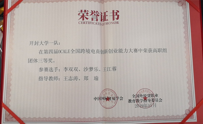 近日,中国国际贸易学会与全国外经贸职业教育教学指导委员会公布了第四届OCALE全国跨境电商创新创业能力大赛结果,我校财政经济学院两支代表队分别荣获大赛团体二等奖和团体三等奖。