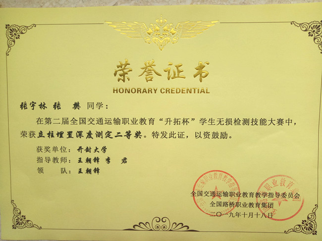 近日,第二届全国交通运输职业教育“升拓杯”学生无损检测技能大赛”在辽宁省沈阳市交通高等专科学校落下帷幕,经过几天激烈角逐,我校土木建筑工程学院王朝锋、李君老师指导的道路桥梁工程技术专业学生张宇林、张樊取得立柱埋置深度测定项目二等奖。