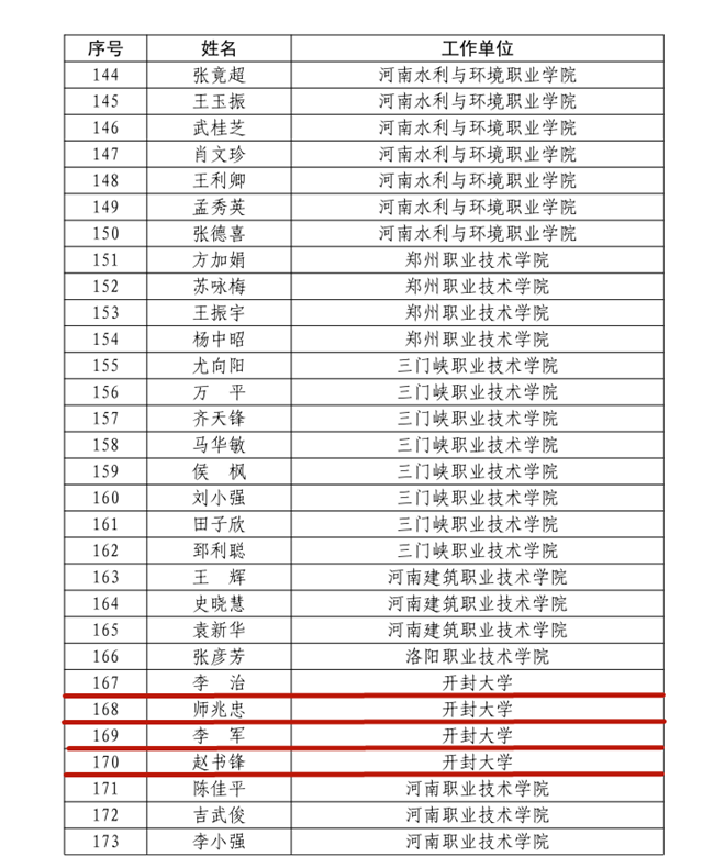 本站讯 近日,河南省教育厅、河南省人力资源和社会保障厅发布了《河南省教育厅河南省人力资源和社会保障厅关于公布2021年河南省职业院校省级名师和省级骨干教师培育对象名单的通知》(教职成〔2022〕115号)。我校李治、师兆忠、李军、赵书锋4位教师被评为2021年河南省职业院校省级名师培育对象,李响、刘悦、王晓婷、边疆、蒋大山、李林6名教师被评为2021年职业院校省级骨干教师培育对象。