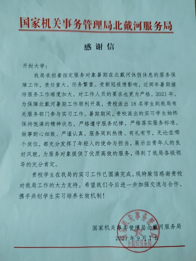 本站讯 9月6日,国家机关事务管理局北戴河服务局就我校旅游学院2019级学生暑期顶岗实习中的优秀表现向我校发来感谢信,对学校给予的大力支持和学生在岗位上的辛勤付出表示由衷的感谢。