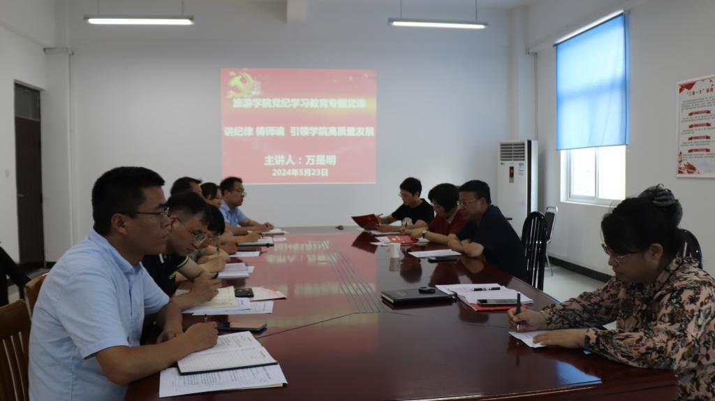 5月23日,旅游学院教工党支部在学院会议室召开“扎实推进党纪学习教育,营造风清气正院风”主题党日活动,校党委委员、副校长万是明同志及学院全体教工党员参加,活动由学院党总支书记尤影同志主持。