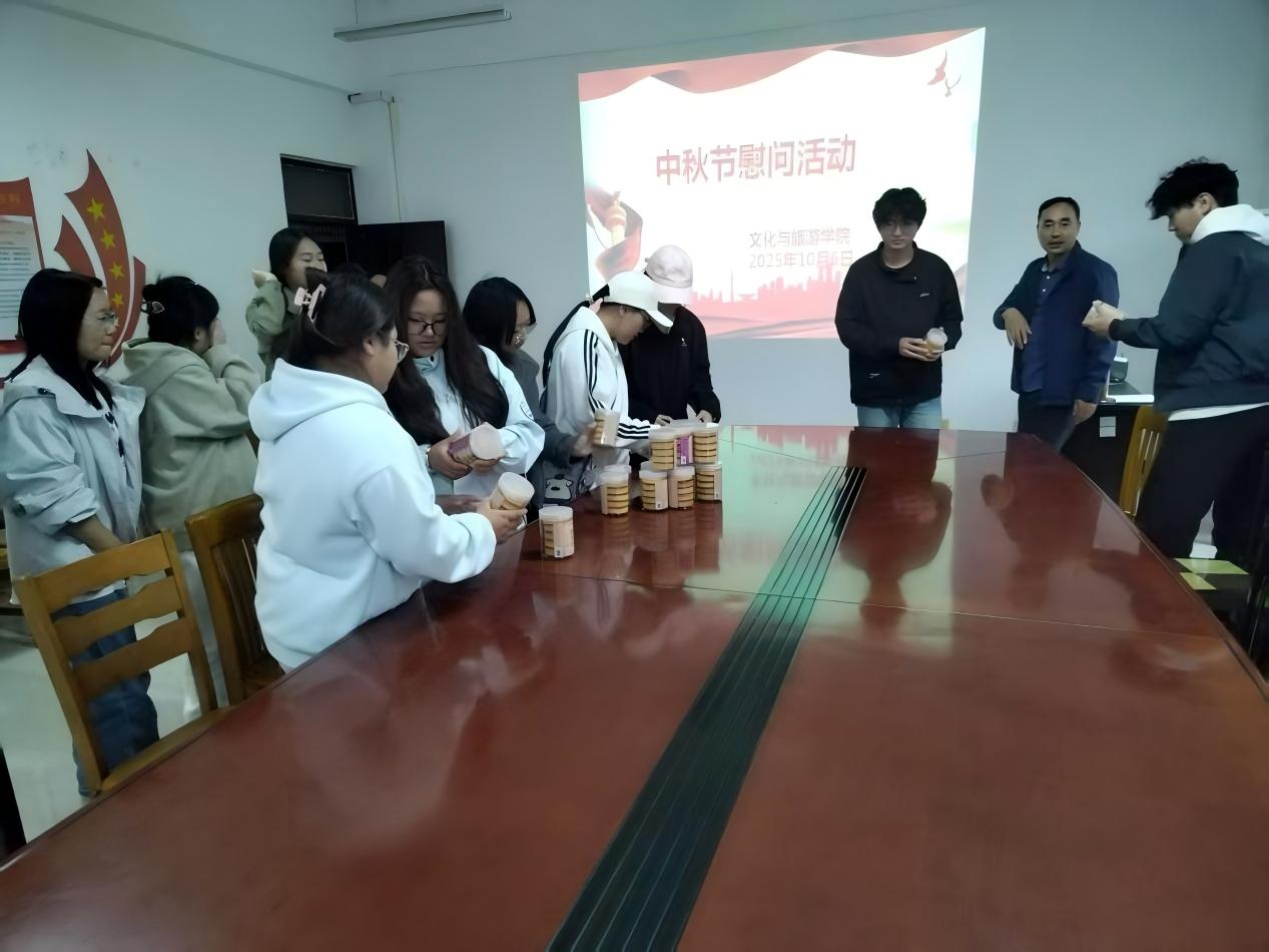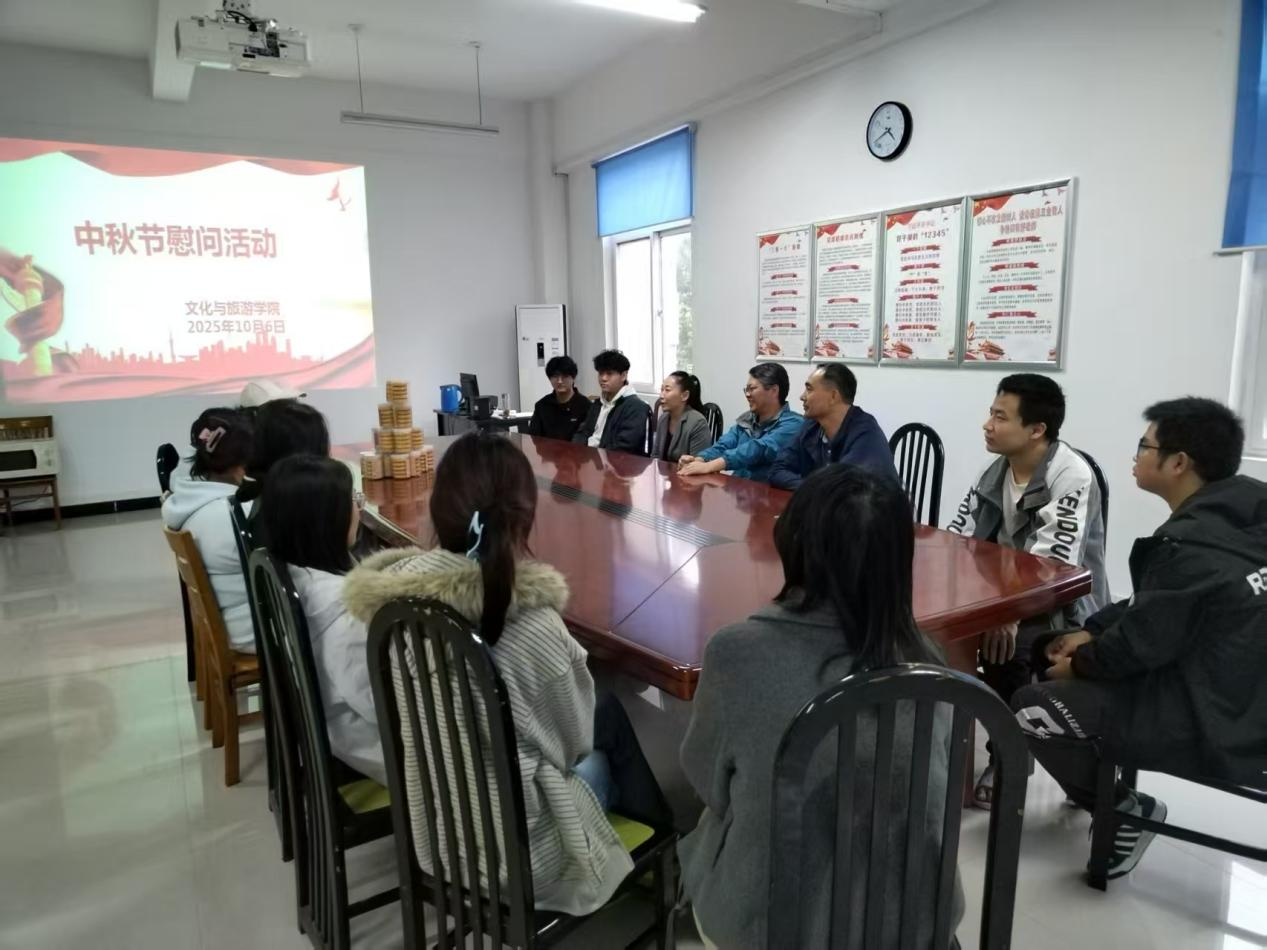 10月6日中秋佳节,文化与旅游学院党总支书记梁波、院长赵瑾带领学院学工团队,在学院二楼会议室开展中秋节学生慰问活动,为留校学子送上节日祝福与香甜月饼,传递浓浓的师生情谊。