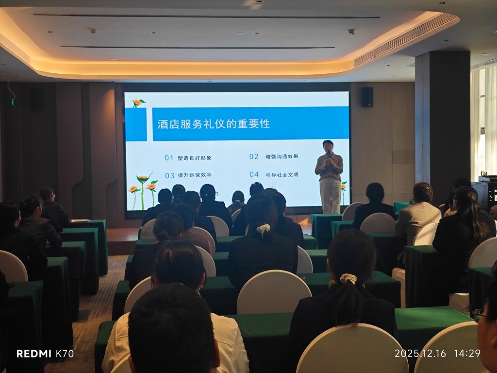 2025年12月16日下午,文化与旅游学院张海玲老师受邀为开封文澜国际酒店进行了一场主题为《酒店服务礼仪》的专项培训。