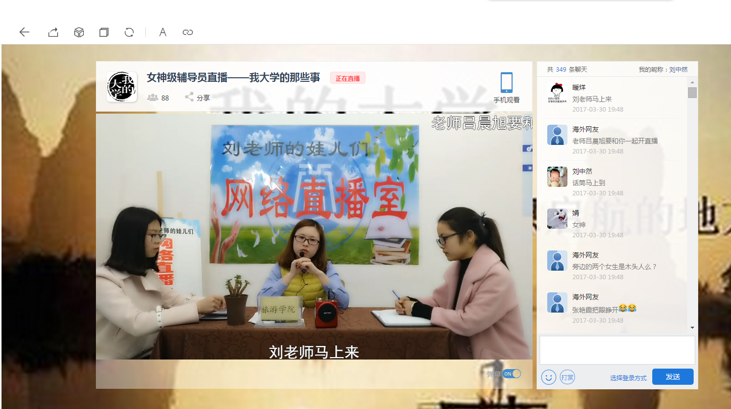 本次网络直播的活动的顺利开展,对于扩展学生和老师之间的交流渠道,增强学院思想政治教育的效果起到了重要作用。