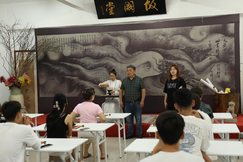 师生一行先参观了京东乡村振兴产业学院精心打造的宋文化展厅,在器物与图文的交织中触摸历史脉搏,感受“茶兴于宋”的繁华;随后在茶文化实训室,王东大师现场示范七汤点茶法,当茶筅击拂茶汤泛起细腻持久的“雪沫乳花”,外国学子们执筅击拂,惊喜写下“茶”字,现场茶香袅袅,笑语阵阵。
