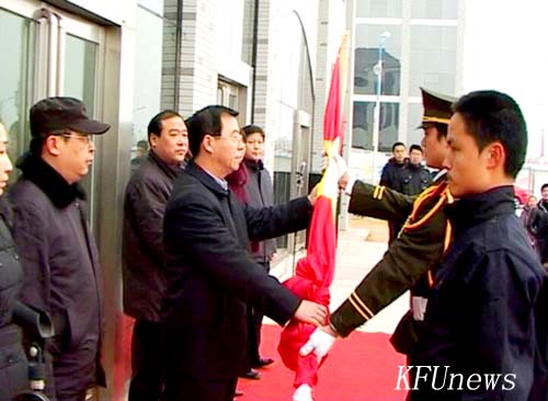 本站讯 2月28日清晨,我校在晋安路校区和东京大道校区分别举行新学期升国旗仪式。校升旗手分别从党委书记莫华林和校长拜五四手中迎过国旗,将神圣的国旗冉冉升起。全校万余名师生员工行注目礼,高唱国歌。党委副书记、副校长储建新和副校长赵辉讲话,两名学生代表分别发言。仪式分别由学工部长陈岩和校团委书记樊玉霞主持。