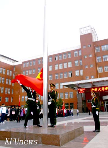 鲜艳的五星红旗在初春开大清新的校园中迎风飘扬。