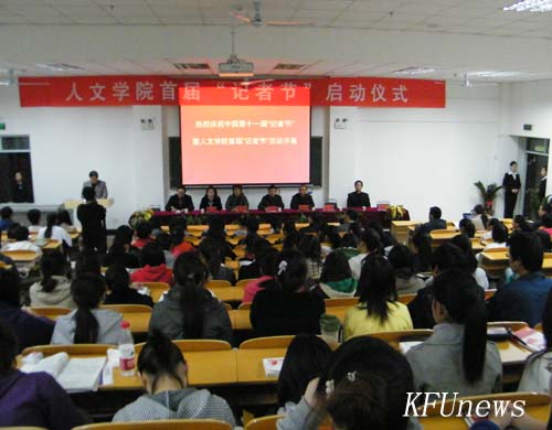 本站讯 为庆祝我国第十一个“记者节”的到来,人文学院举办“记者节”系列活动。11月8日下午, 我校记者节系列活动启动仪式在东京大道校区教学楼116教室举行。副校长万是明,校团委书记樊玉霞、东京大道校区综合管理办公室主任侯彦喜、人文学院党总支书记阴平、院长赵瑾、新闻专业同学和省市媒体的记者二百余人参加了本次启动仪式。仪式由人文学院团总支负责人刘杨主持。
