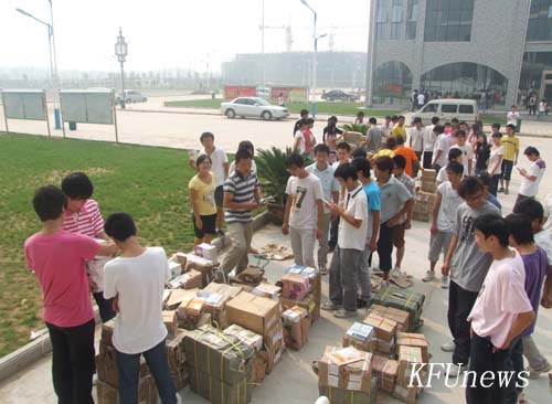 本站讯 8月30日上午,新校区教学楼门前,一堆堆教材摆放整齐,周围有很多学生,有的在和老师一起清点数量,有的正准备搬书。记者走到前,发现被学生围着的老师是教务处处长吴玺玫和教务处的其他同志。吴处长告诉记者:“以前都是院部派人到教材科领取各院的学生教材,今年财经学院、人文学院两院刚刚搬到新校区,为了减少两院的工作压力,教务处全体出动,用学校派的专车把教材运到这里,直接分发到院里,确保同学们提前拿到新教材,保证新校区按时开课。”