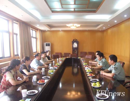 本站讯 7月30日下午,“八一”建军节前夕,校党委副书记、副校长储建新在党政办公室、宣传部、学工部和就业指导中心负责人的陪同下,带着慰问品及全校师生的拥军热情,到开封市军分区和开封市武警支队进行走访慰问,为部队官兵送去节日的祝福和问候。部队领导热情接待了我校慰问团,并对我校的走访慰问表示欢迎和感谢。我校慰问团和部队领导就以往开展的军民共建工作进行了深入交谈,并就今后的共建工作交换了意见。