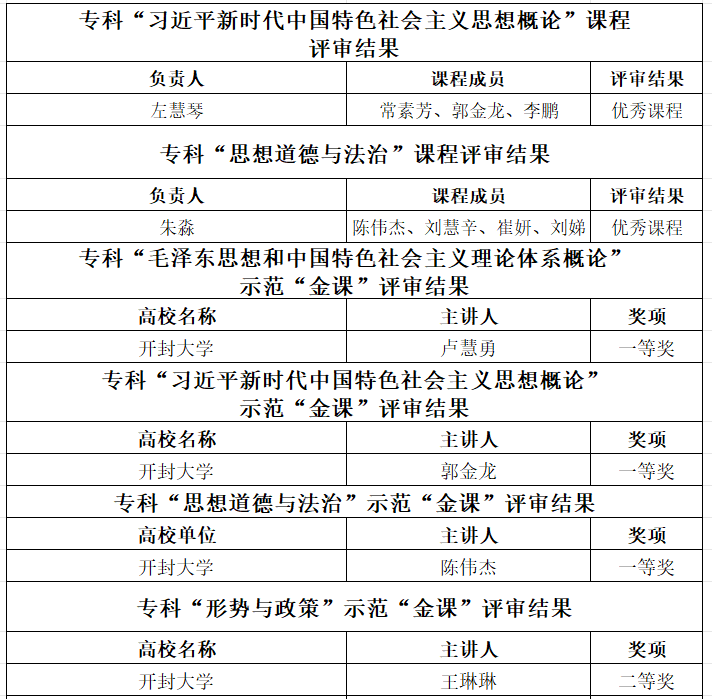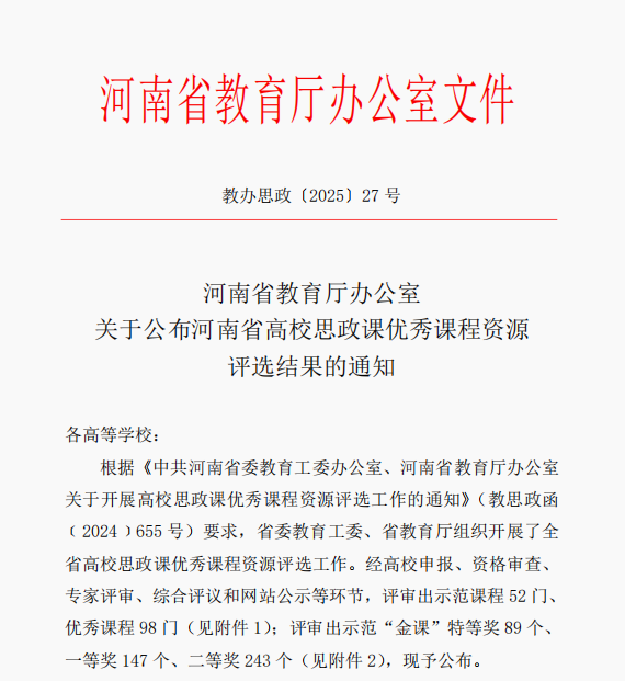 近日,河南省教育厅办公室下发了《关于公布河南省高校思政课优秀课程资源评选结果的通知》,我校马克思主义学院申报的2门课程获批优秀课程,申报的4门示范 “金课”分获 一等奖3项、二等奖1项。