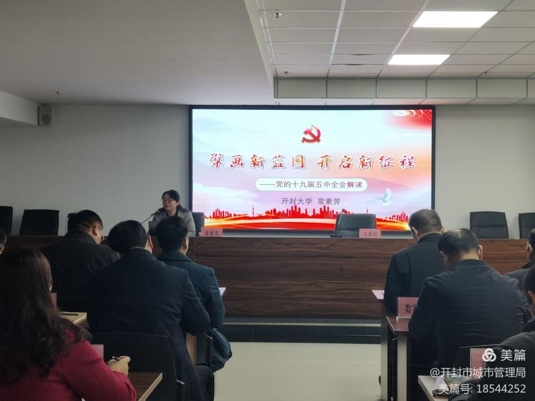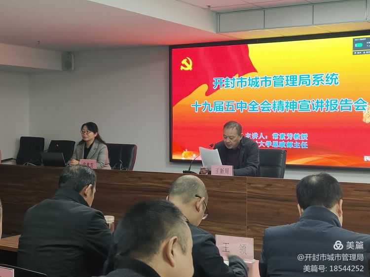 12月25日上午,市城管局组织召开了十九届五中全会精神宣讲报告会,会议由党组成员、副局长王新周同志主持,局领导班子全体成员、局机关科长、副科长,局属各单位班子成员及党务工作者参加,报告会由bat365在线官方网站思政部主任、河南省高等学校思想政治理论课优秀教师、河南省高校思想政治理论课奖励基金奖励对象常素芳教授为大家授课。