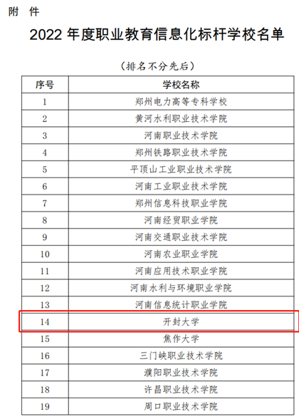 2月12日,《河南省教育厅办公室关于公布2022年度职业教育信息化标杆学校名单的通知》公布了河南省教育信息化标杆学校,共评选出39所职业教育信息化标杆学校,其中高职院校28所,我校成功入选。