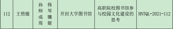 我馆流通服务部主任王艳敏同志申报的《高职院校图书馆参与校园文化建设的思考》项目编号HNTQL-2021-112获得立项。